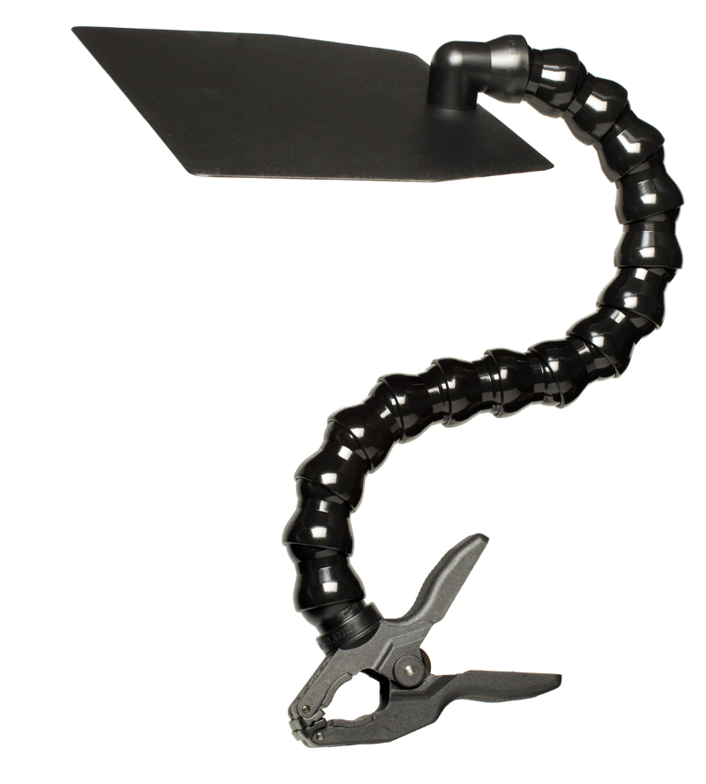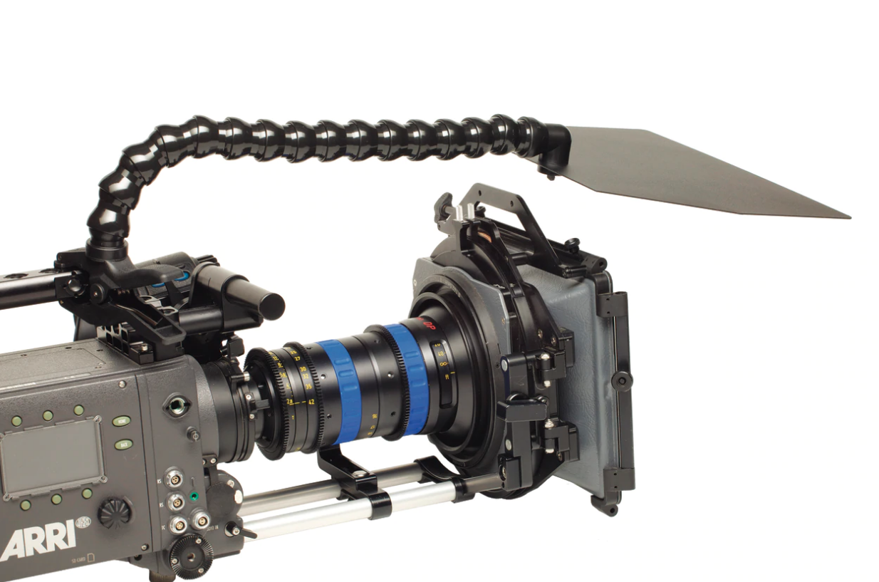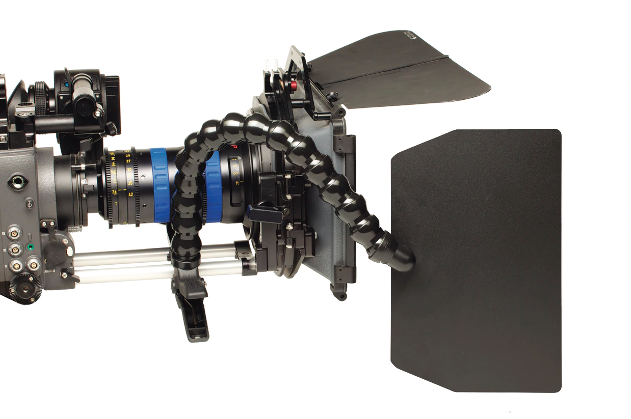 Dinkum Systems – Cine line lens shade. Designed for use on larger film and video cameras, the CINE™ lens shade, or “french flag”, attaches quickly and accurately to multiple points on the camera body or mattebox. The surprisingly strong plastic clamp has 1.5”-wide rubber-coated jaws and pivoting rubber tips which ensure a solid base, enabling multiple points of attachment, yet eliminating scratches or damage to equipment.