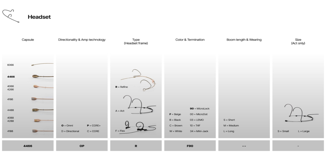 Pyrimme tällä sivulla avaamaan nykyisin käytettävän tuotekoodin eri osien merkityksen. Huomioi, että tuotekoodi ei ole itsemuokattava ”kasaa-oma-unelmamikrofonisi” -tyylinen ”toivelistaus”, vaan tuotekoodi on valmistajan mallikohtaisesti määrittämä. Koodista on helppo varmistaa että tilaukseesi tulee varmasti oikea mikrofonimalli.