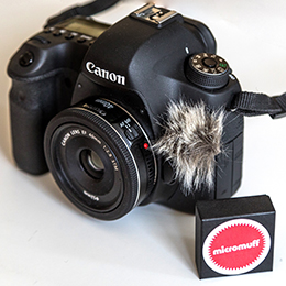 Micrmuff Original toimii kameroiden kanssa joiden mikrofoni aukko on läpimitaltaan max. 6mm.